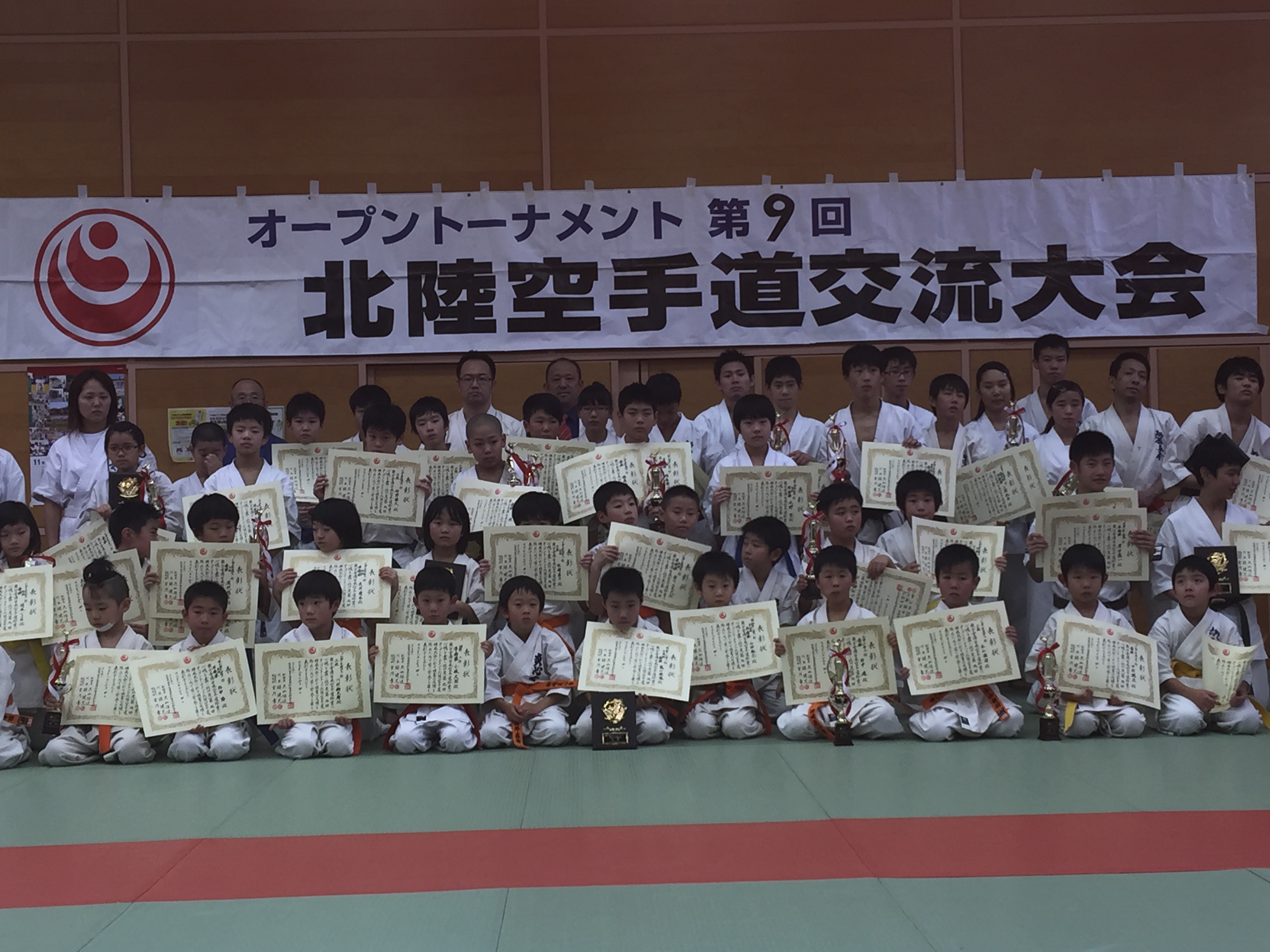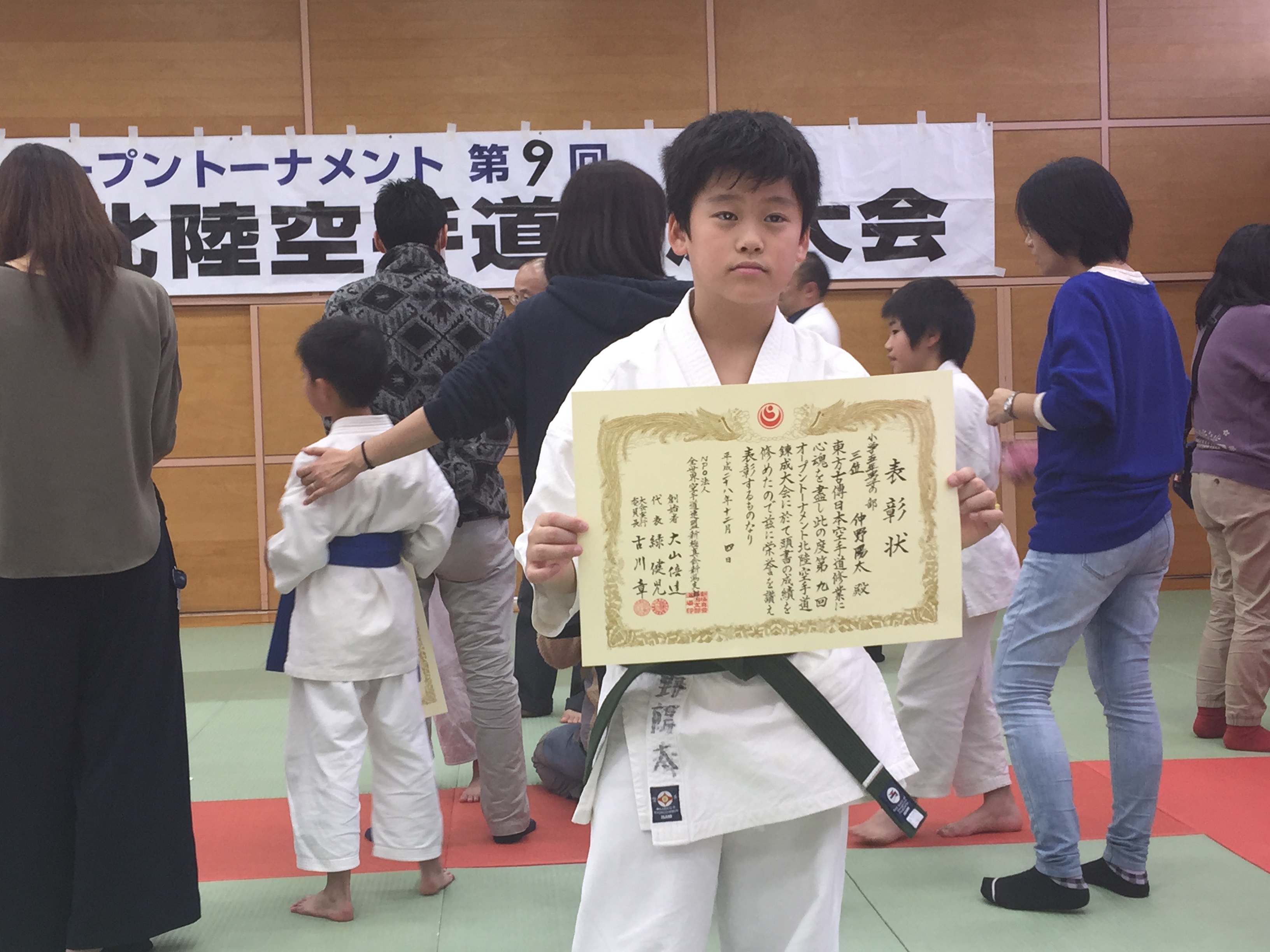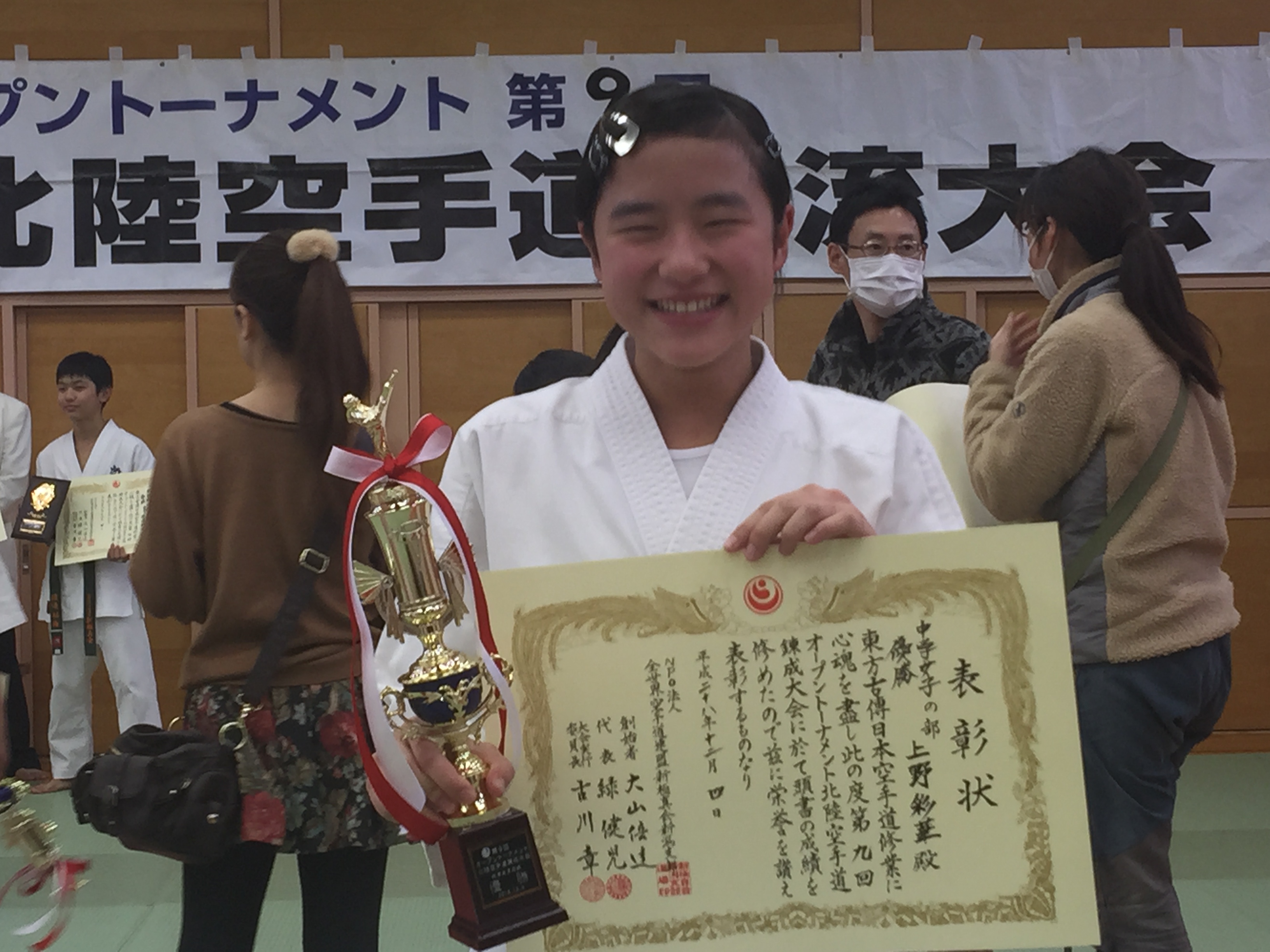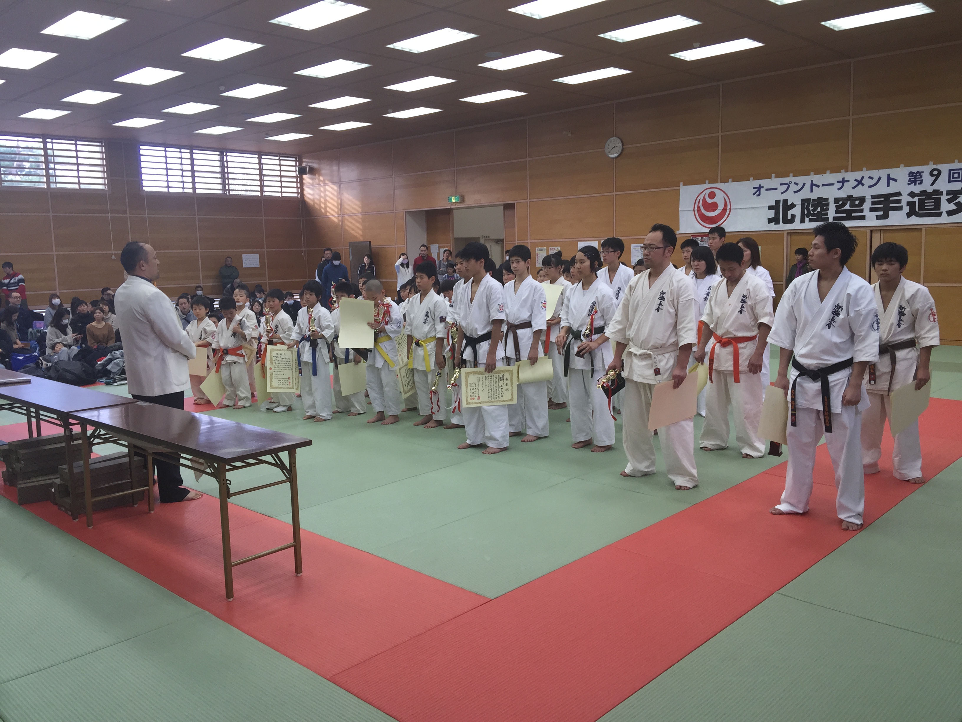 平成28年12月4日(日)、上越市高田スポーツセンターにおいて新極真会主催、オープントーナメント第9回北陸空手道交流大会が行われ、岡田道場から10名の選手が出場し、組手の試合では一般女子の部で高井瑠那選手が優勝、中学女子の部で上野彩華選手が優勝、中学1年男子重量級の部で乙川育蒔選手が準優勝、中学1年男子軽量級の部で三潴琉希選手が準優勝、小学5年男子の部で仲野陽太選手が3位に入賞しました。また、型の試合では小学5・6年初級の部で水野寛選手が準優勝、中・高校上級の部で三潴琉希選手が3位に入賞しました。
