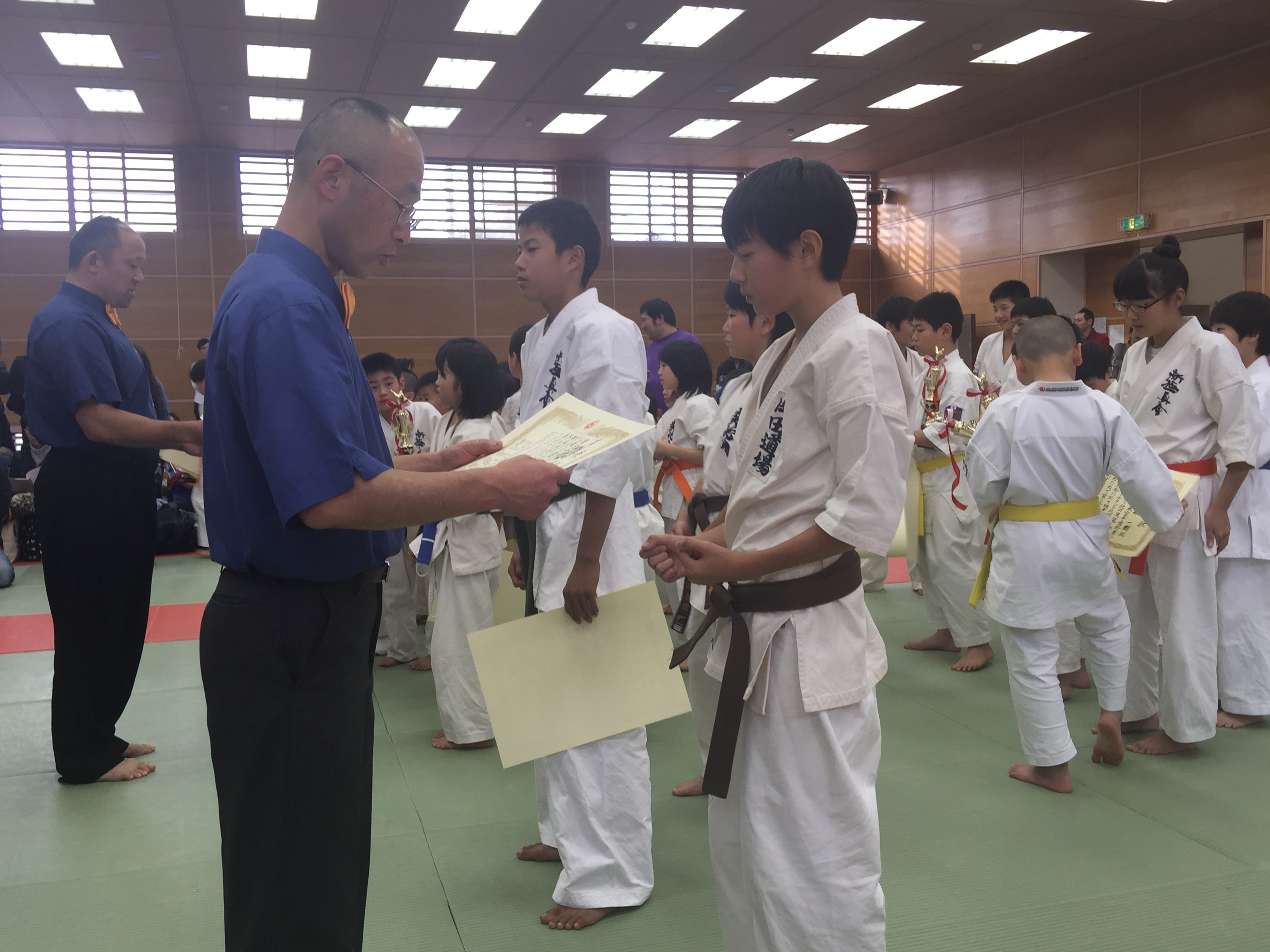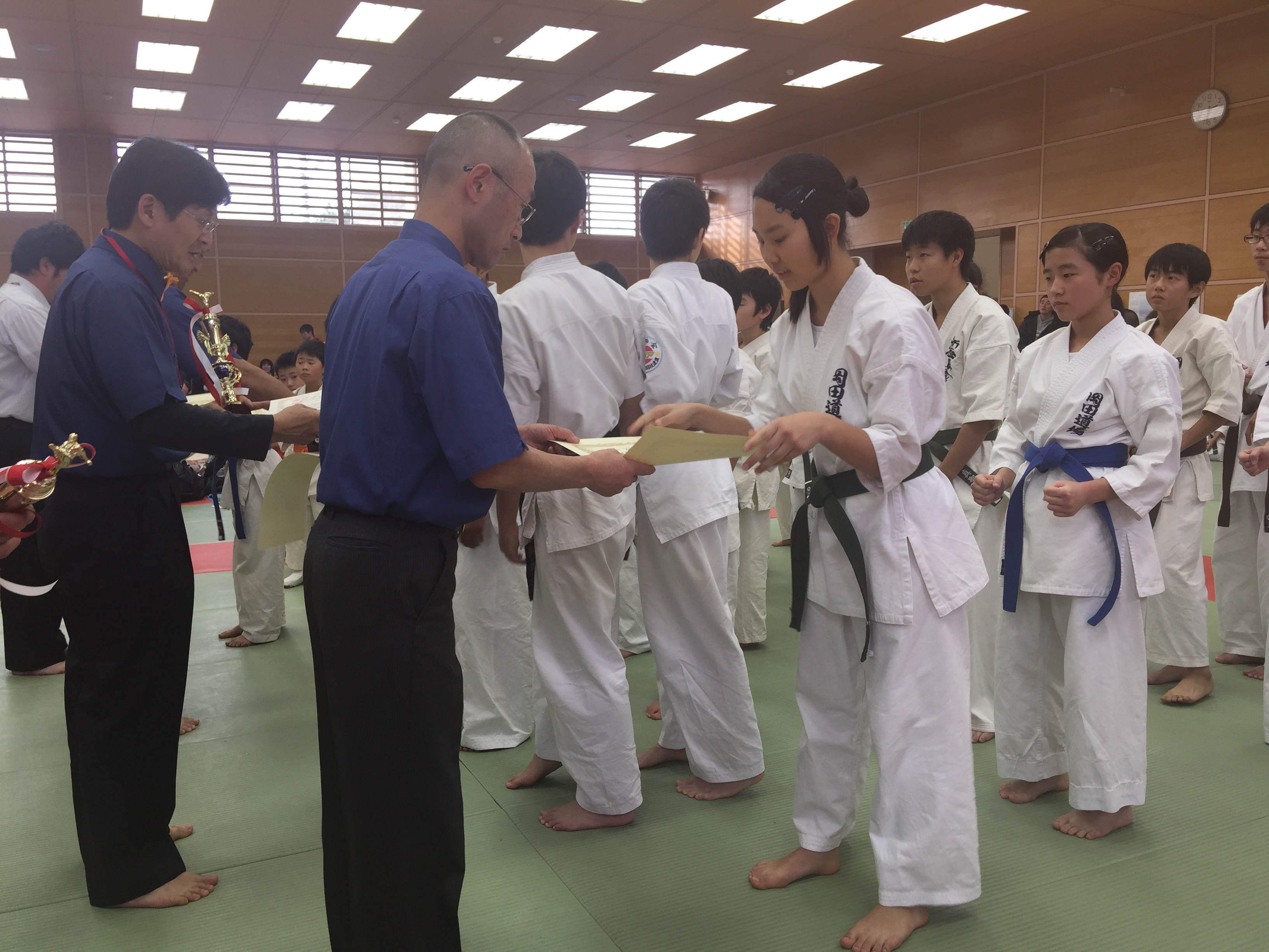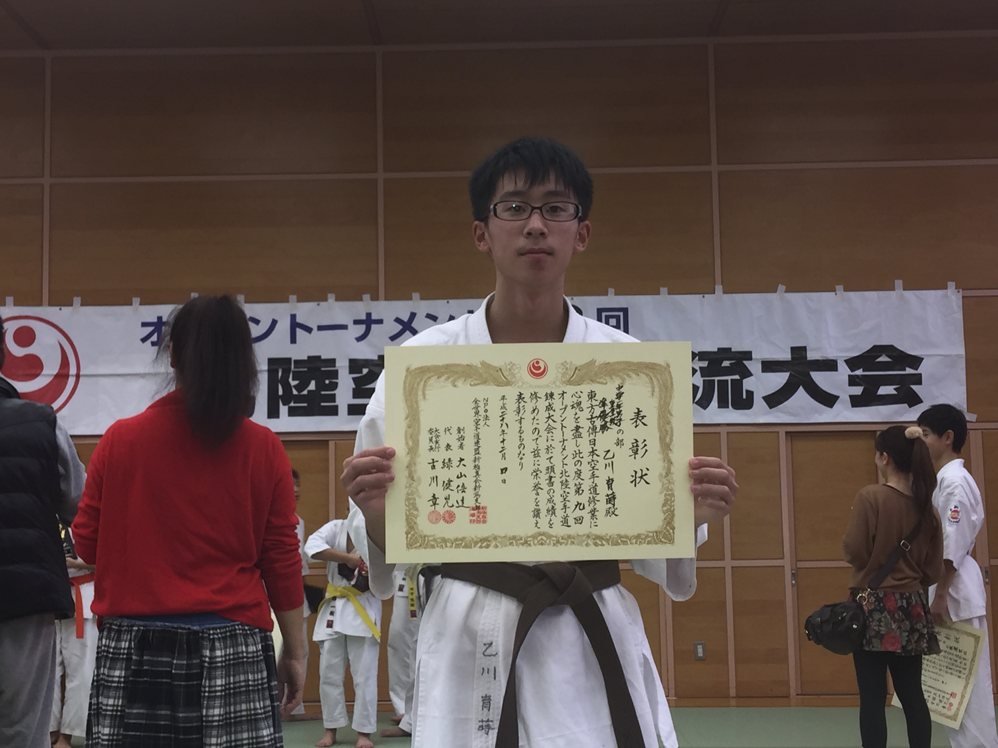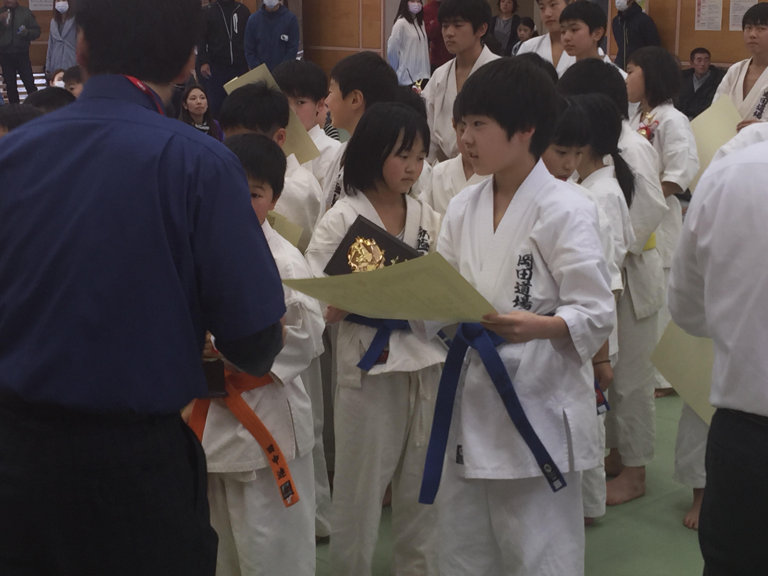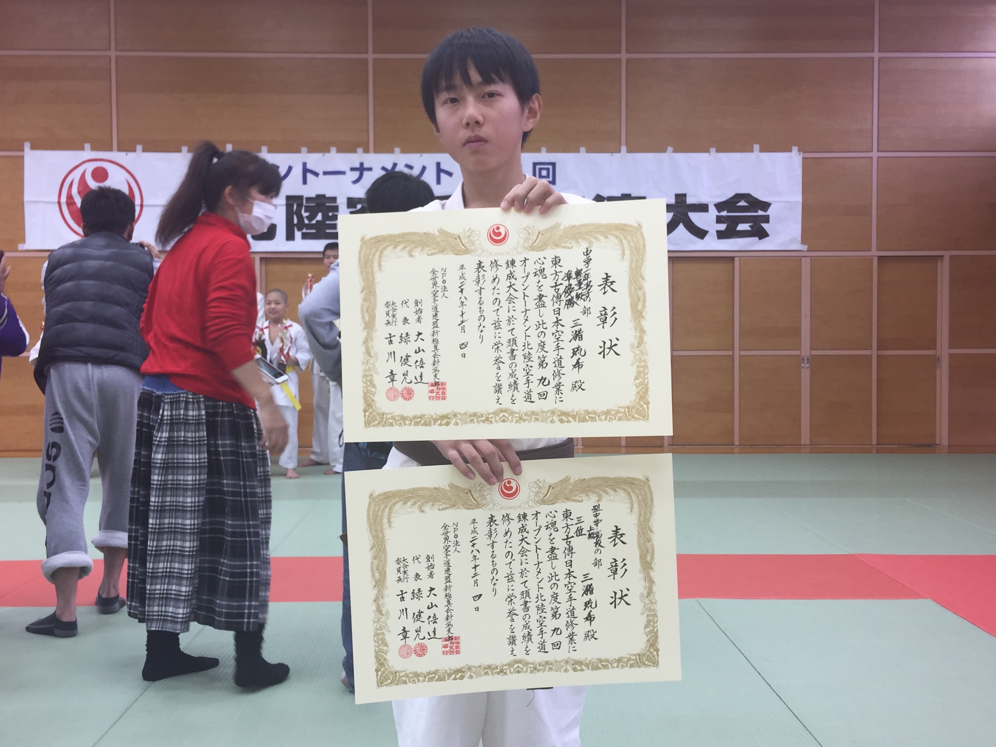 平成28年12月4日(日)、上越市高田スポーツセンターにおいて新極真会主催、オープントーナメント第9回北陸空手道交流大会が行われ、岡田道場から10名の選手が出場し、組手の試合では一般女子の部で高井瑠那選手が優勝、中学女子の部で上野彩華選手が優勝、中学1年男子重量級の部で乙川育蒔選手が準優勝、中学1年男子軽量級の部で三潴琉希選手が準優勝、小学5年男子の部で仲野陽太選手が3位に入賞しました。また、型の試合では小学5・6年初級の部で水野寛選手が準優勝、中・高校上級の部で三潴琉希選手が3位に入賞しました。